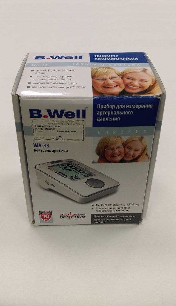 Характеристика товара: Прибор для измерения артериального давления и частоты пульса автоматический WA модели WA-33 Торговая марка B.Well. - диагностика аритмии пульса; - диапазон измерения: давление от 20 до 280 мм.рт.ст; пульс от 40 до 200 ударов в минуту; - индикация давления в манжете от 0 до 290 мм.рт.ст.; - индивидуальный уровень нагнетания воздуха в манжету; - память последнего измерения; - 10 лет бесплатного сервисного обслуживания электронного блока - срок службы не менее 10 лет; - срок гарантии на манжету- 1 год; - дополнительная защита дисплея; - наличие сервисно-консультационного пункта в г. Красноярске.