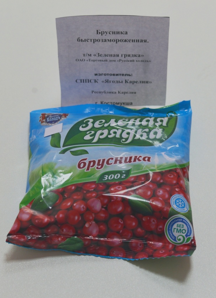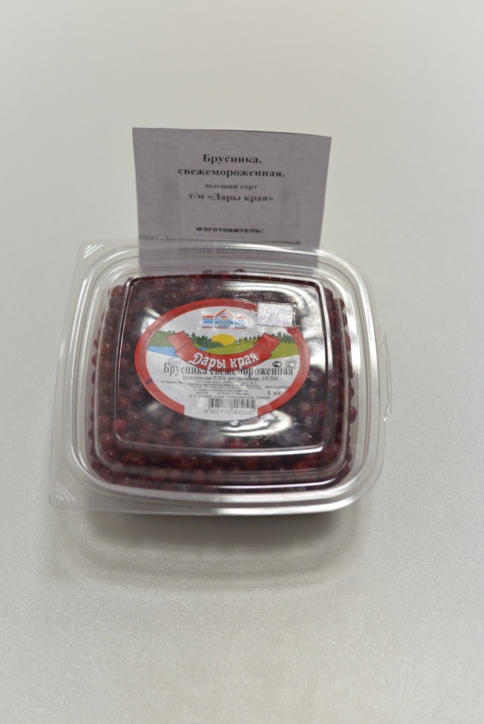 Характеристика товара: Брусника свежемороженная, сорт высший, упакована контейнер из полимерных материалов, масса 500 гр.