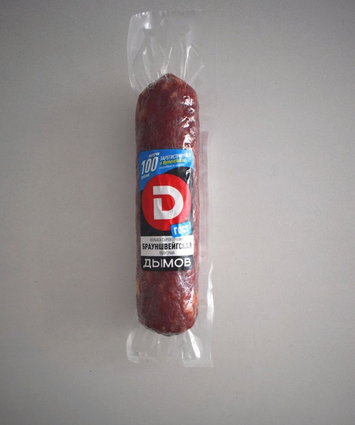 Характеристика товара: Изделие колбасное сырокопченое. Продукт мясной. Колбаса кат. А с применением стартовых культур «Брауншвейгская» полусухая сырокопченая. Охлажденный продукт т/м «Дымов»