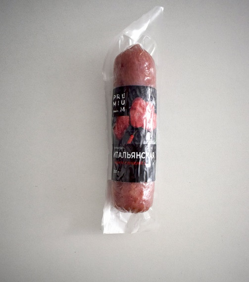 Характеристика товара: Мясной продукт. Сырокопченое колбасное изделие. Колбаса полусухая «Итальянская» т/м «Лента»