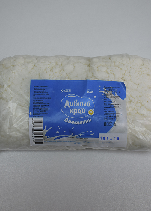 Характеристика товара: Молокосодержащий продукт с заменителем молочного жира, произведенный по технологии творога м.д.ж. 9,0% «Домашний» т/м «Дивный край»