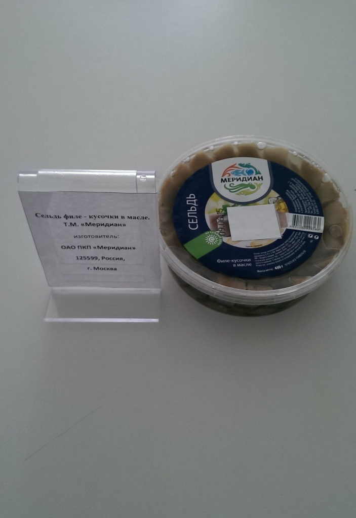 Характеристика товара: Сельдь филе- кусочки в масле. Т/М «Меридиан»