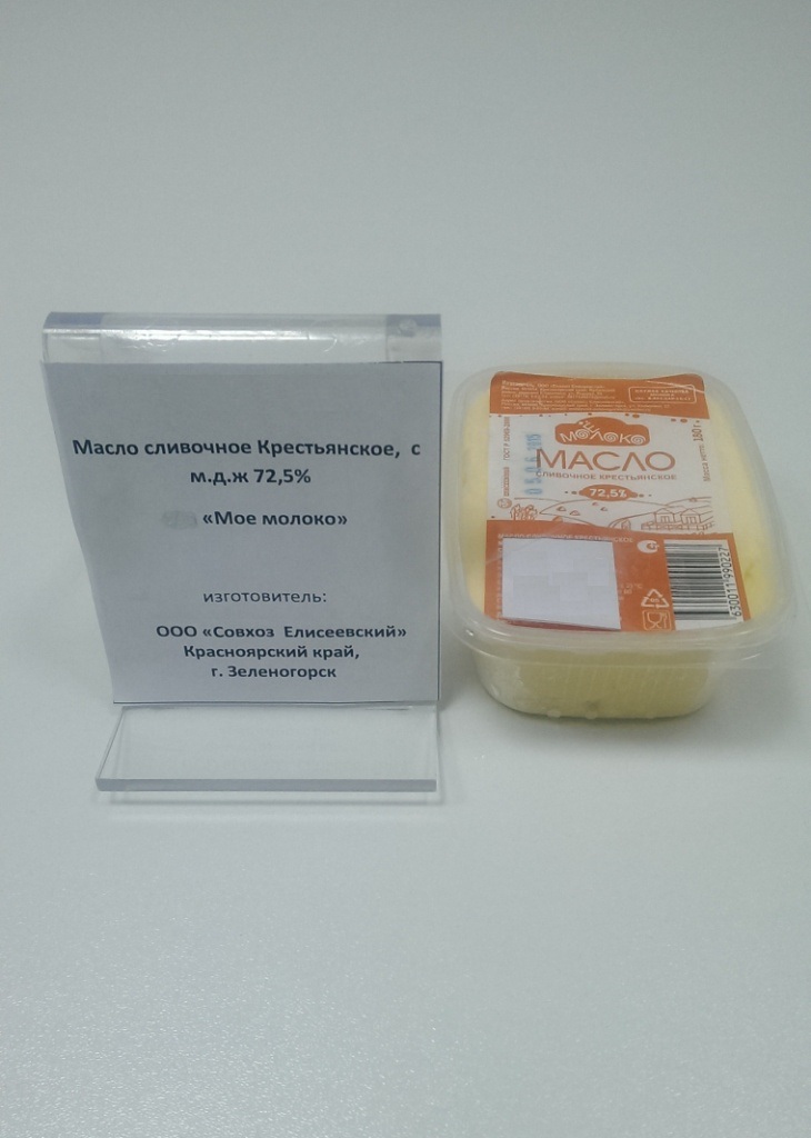 Характеристика товара: Масло сливочное Крестьянское, с мдж 72,5% «Мое молоко». Упаковано в коробочку из полистирола массой нетто 180г.