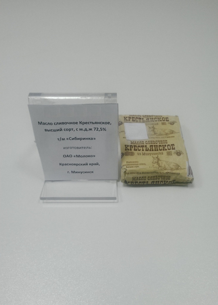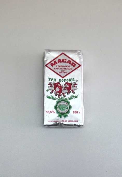Характеристика товара: Масло сливочное, Крестьянское, высший сорт, с мдж 72,5%. Упаковано в кашированную фольгу массой нетто 180г.