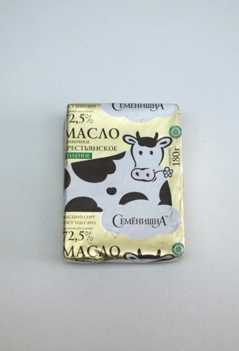 Характеристика товара: Масло сливочное, Крестьянское, не соленое, высший сорт с мдж 72,5%, т/м «Семенишна». Упаковано в кашированную фольгу массой нетто 180г.