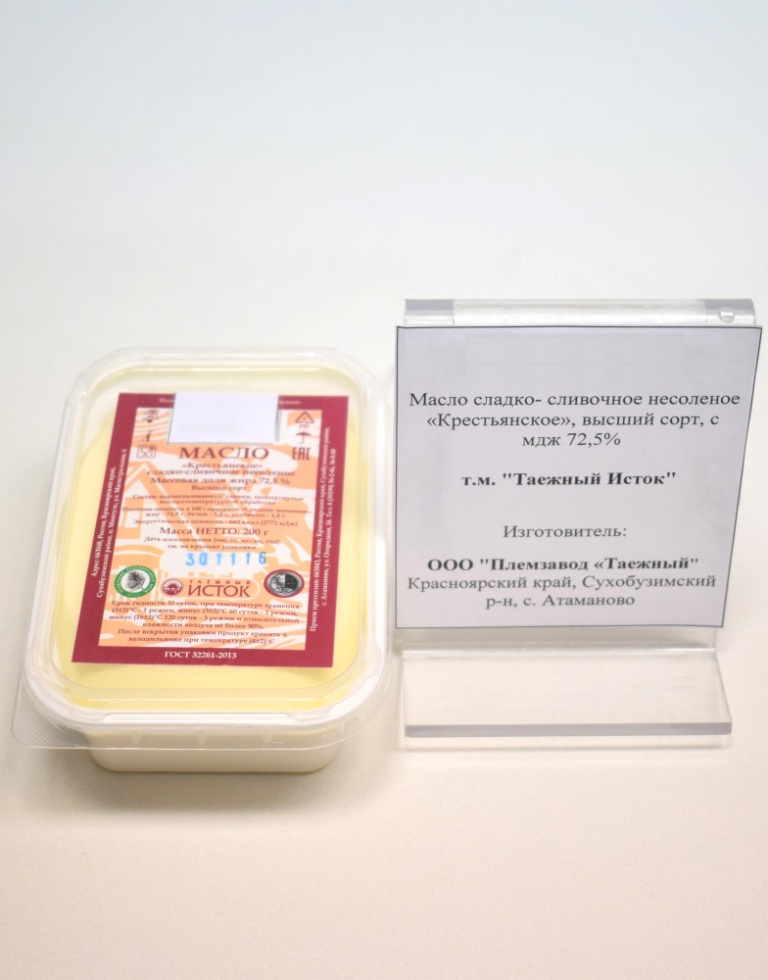 Характеристика товара: Масло сливочное Крестьянское, высший сорт с мдж 72,5%. т/м «Таежный Исток».Упаковано в коробочку из полистирола массой нетто 200г.
