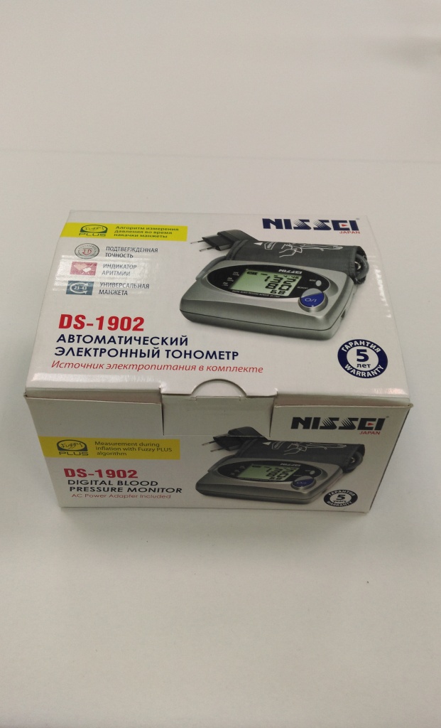 Характеристика товара: Прибор для измерения артериального давления и частоты пульса цифровой автоматический торговой марки Nissei модели DS - 1902. - индикатор аритмии; - диапазон индикации давления в манжете от 0 до 300 мм рт.ст.; - диапазон измерений: давления в манжете от 40 до 250 мм.рт.ст; частоты пульса от 40 до 160 ударов в минуту; - две памяти по 30 измерений (давление, пульс, дата, время) с функцией вычисления среднего значения; - интеллектуальная система подстройки прибора под пульс пользователя; - измерение давления во время накачки манжета; - электронный клапан быстрого сброса давления в манжете; - срок службы прибора (без учета манжеты) 7 лет; - срок службы манжеты- 3 года; - наличие сервисно-консультационного пункта в г. Красноярске.