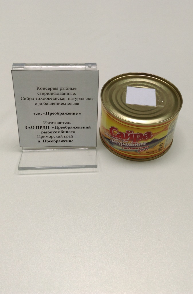 Характеристика товара: Консервы рыбные стерилизованные. Сайра тихоокеанская натуральная с добавлением масла т/м Преображение»