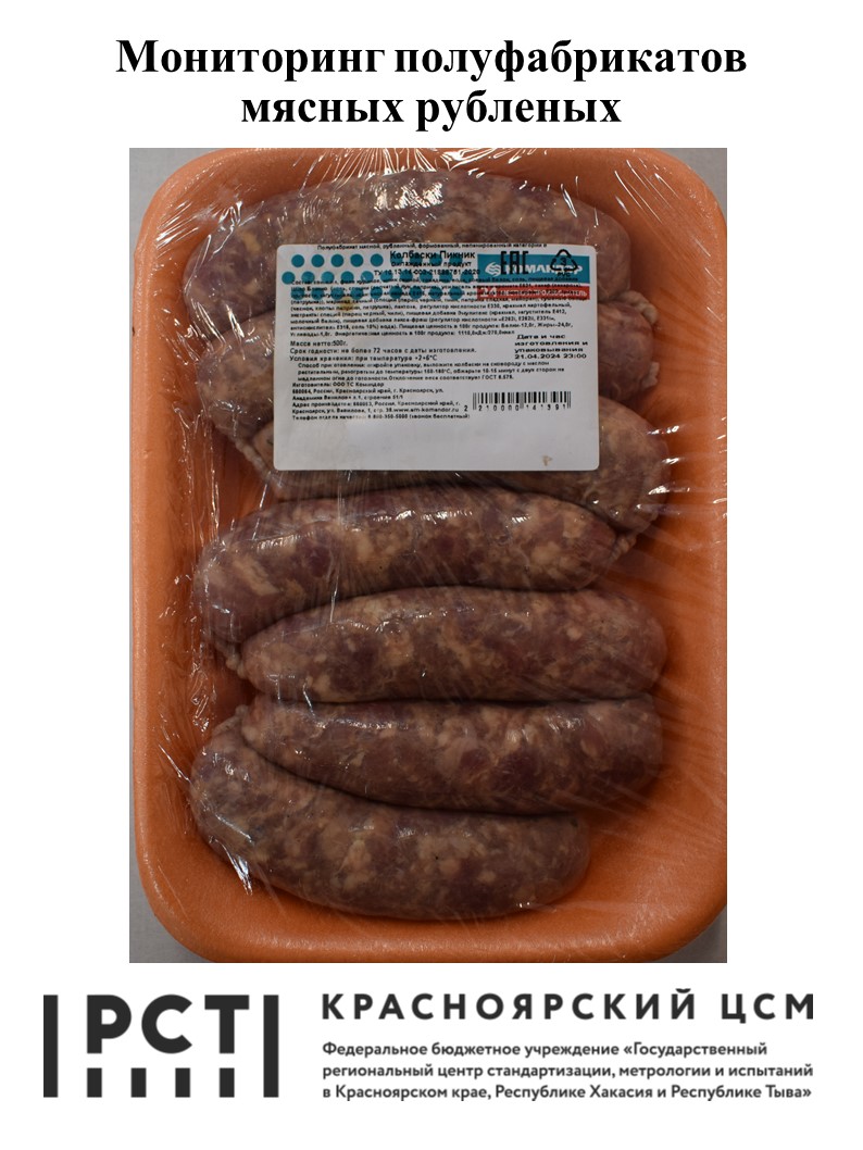 Мониторинг полуфабрикатов мясных рубленых проведен ФБУ «Красноярский ЦСМ» согласно письму Министерства сельского хозяйства Красноярского края (исх № 11-25/908 от 20.02.2024), заявкам, поступившим на сайт «Проднадзор. Инфо» и плану проведения мониторингов ФБУ «Красноярский ЦСМ» на 2 кв. 2024 года с целью оценки качества и безопасности пищевой продукции, реализуемой на территории Красноярского края. Для проведения мониторинга в торговых сетях г. Красноярска были приобретены 9 образцов полуфабрикатов мясных рубленых, изготовленных в Красноярском и Алтайском краях, Омской, Брянской и Томской областях, Республике Татарстан. На момент приобретения образцов продукции в торговых сетях нарушений условий хранения не установлено. Продукция после приобретения ее в торговых сетях была уложена в сумку - холодильник и доставлена в ФБУ «Красноярский ЦСМ». После доставки продукции в ЦСМ она была направлена для испытаний. В ходе проведения мониторинга продукция исследовалась в аккредитованном испытательном центре (ИЦ) ФБУ «Красноярский ЦСМ» по микробиологическим показателям. Кроме того, продукция в ходе проведения мониторинга была проанализирована по маркировке потребительских упаковок в части указания информации о наименовании продукта, предприятии-изготовителе, дате изготовления и сроках годности, условиях хранения, составе и др. на соответствие требованиям ТР ТС 022/2011 «Пищевая продукция в части ее маркировки», ТР ТС 034/2013 «О безопасности мяса и мясной продукции», ТР ЕАЭС 051/2021 «О безопасности мяса птицы и продукции его переработки».