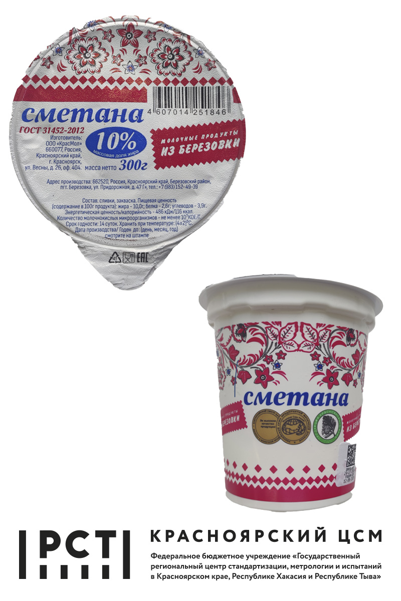 Следует отметить, что закуп сметаны в торговых сетях был проведен в присутствии представителей следующих предприятий: ООО «КрасМол», ООО «АгроНик», ООО «Нарада», АО «Барнаульский молочный комбинат», ООО «Алтайская Буренка», СПК «Камарчагский». В ходе проведения мониторинга продукция исследовалась в аккредитованном испытательном центре ФБУ «Красноярский ЦСМ» по физико-химическим показателям (м.д. жира, м.д. белка) по наличию крахмала, сорбиновой и бензойной кислот и по микробиологическим показателям, а также по наличию растительных жиров в жировой фазе продукта. Кроме того, образцы оценивались по маркировке в части указания на по-требительских упаковках информации о предприятии-изготовителе, дате изготовления и сроках годности, условиях хранения, составе и др. в соответствии с требованиями ТР ТС 022/2011 «Пищевая продукция в части ее маркировки», ТР ТС 033/2013 «О безопасности молока и молочной продукции» и нормативной документации.