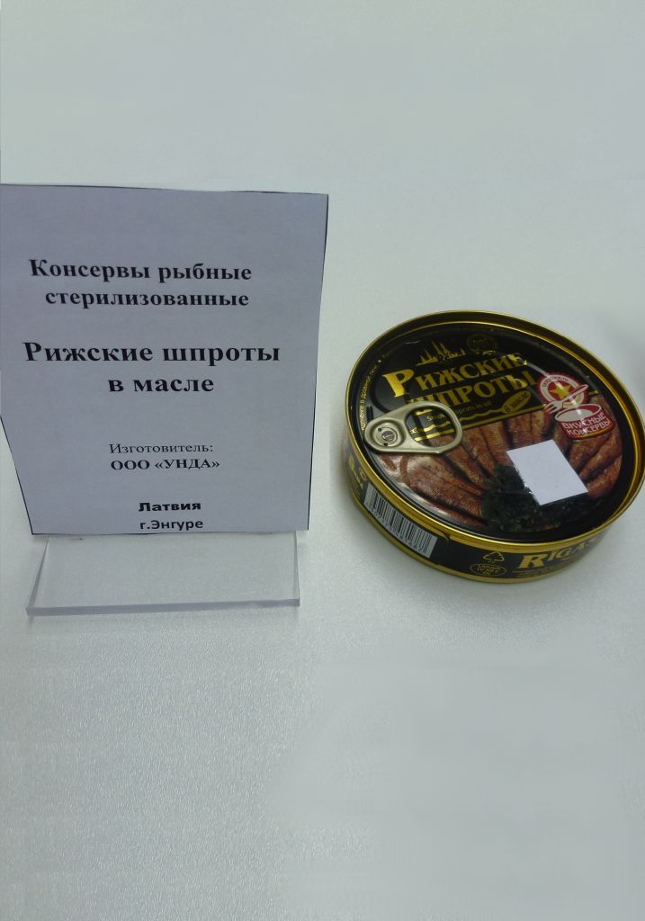 Для проведения рейтинговой оценки в торговой сети г. Красноярска были закуплены 12 образцов, в том числе 2 образца, изготовленных по ГОСТ 280-2009 «Шпроты в масле. Технические условия» и 10 образцов, изготовленных по нормативной и технической документации стран Прибалтики. Образцы оценивались в соответствии с ГОСТ 4.31 – 82 «Система показателей качества продукции. Консервы и пресервы из рыбы и морепродуктов. Номенклатура показателей» по показателям назначения (вкус, запах, массовая доля составных частей, консистенция мяса рыбы, наличие чешуи, состояние масла, отстой в масле); по эстетическим показателям (характеристика разделки, порядок укладывания рыбы, цвет кожных покровов, состояние кожных покровов, размер рыбы); по маркировке (полная информация для потребителя, ее достоверность, однозначная считываемость информации в части указания изготовителя, даты изготовления, срока и условий хранения, срока годности и др.) в соответствии с требованиями нормативной (ГОСТ Р 51074 – 2003 «Продукты пищевые. Информация для потребителя. Общие требования», ГОСТ 280-200 «Консервы из копченой рыбы шпроты в масле. Технические условия». Дегустационная оценка консервов рыбных «Шпроты в масле» проводилась по десяти показателям. Максимальная оценка должна была составить 53 балла, минимальная – 11 баллов.