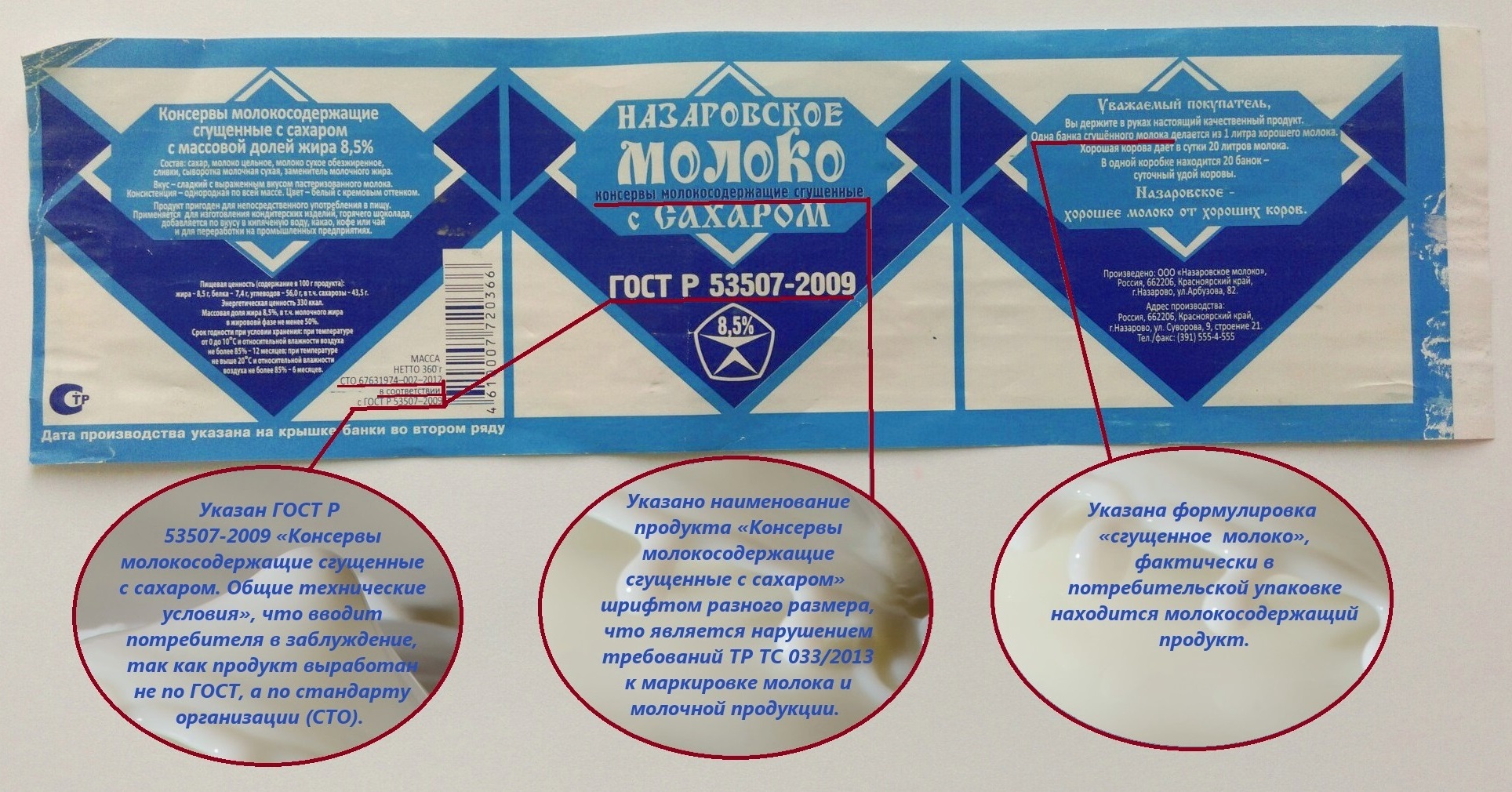 Согласно раздела 12, п. 95 ТР ТС 033/2013 Технический регламент Таможенного союза «О безопасности молока и молочной продукции» наименование продукта указывается на передней стороне потребительской упаковки с использованием шрифта одного размера не менее 9,5 кегля (3,4 мм), наименование продукта переработки молока должно наноситься в соответствии с понятиями, установленными разделом 2 , ТР ТС 033/2013. Изготовитель ООО «Назаровское молоко» (адрес производства: Красноярский край, г. Назарово, ул. Суворова,9, строение 21) на передней стороне упаковки указал наименование продукта «Консервы молокосодержащие сгущенные с сахаром» шрифтом разного размера, что является нарушением требований ТР ТС 033/2013 к маркировке молока и молочной продукции. Так же на передней стороне упаковки указан ГОСТ Р 53507-2009 « Консервы молокосодержащие сгущенные с сахаром. Общие технические условия», что вводит потребителя в заблуждение, так как продукт выработан не по ГОСТ, а по стандарту организации (СТО). Стандарт организации – это нормативный документ, устанавливающий технические требования, которым должна соответствовать продукция.