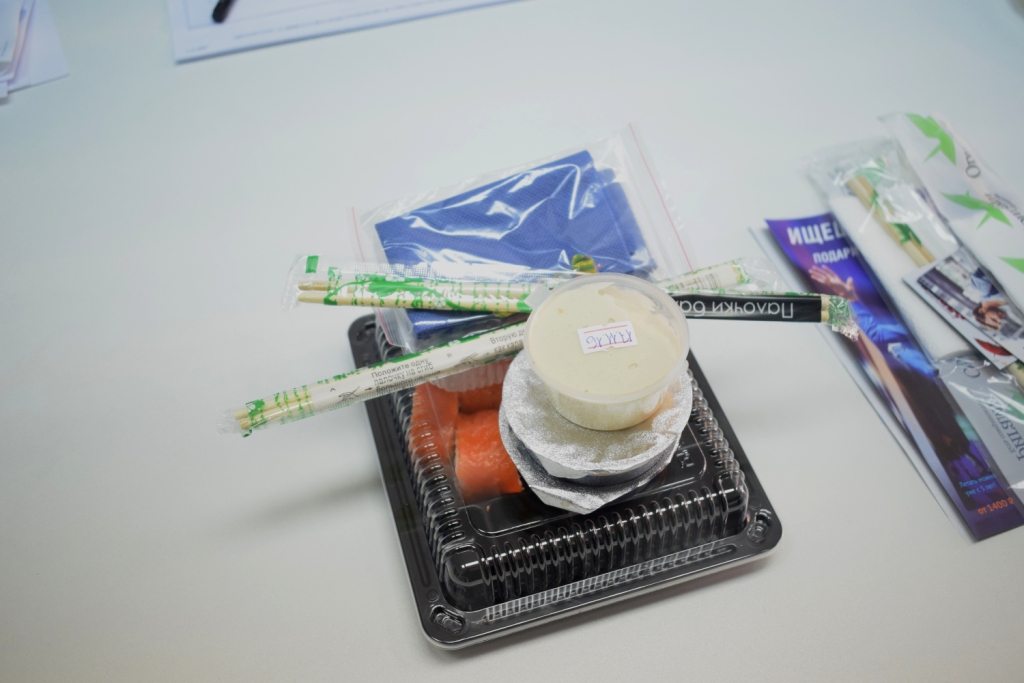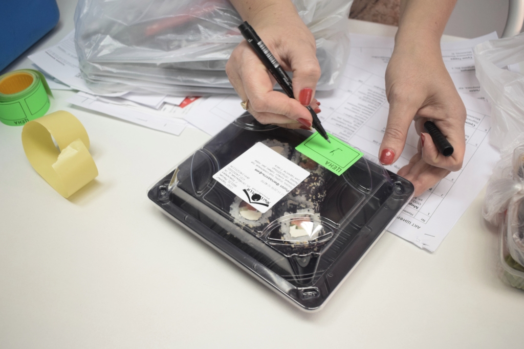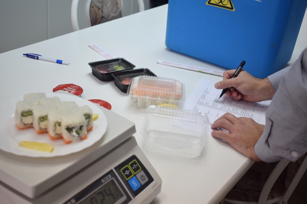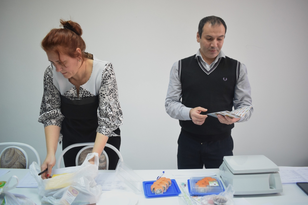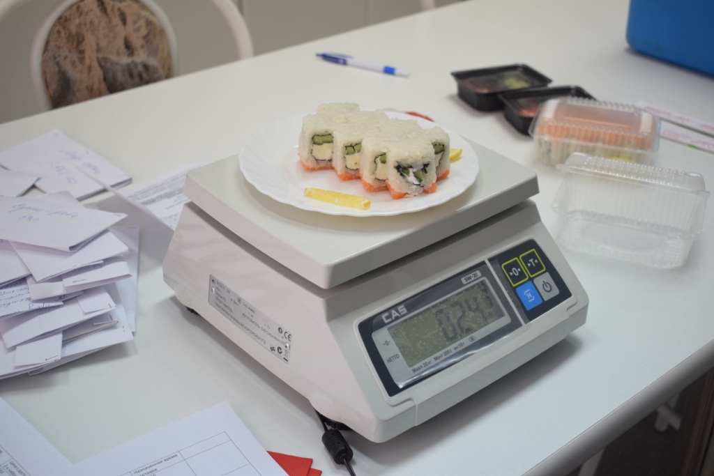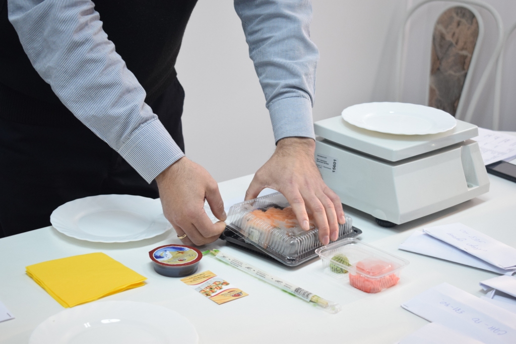 Специалисты Центра заказали роллы «Филадельфия» 13 компаниям, занимающихся их изготовлением и доставкой. Изначально планировалось закупить продукцию в 15-ти компаниях, однако в двух из - них не ответили на звонки экспертов. Напомним, что заказ производился на конкретное время, за сутки до мероприятия. В итоге, к определенному времени доставили продукцию 12 компаний («Мир суши», «Время суши», «Суши-рыба», «Фудзи», «Венеция», «Суши-Терра», «Якитория», «Оригами», «ТАКИ», «Яр Суши», «Цунами» и «Суши Куб»). Компания «СЭН-ТО», в день доставки, отказалась от исполнения заказа – по причине поломки автомобиля. В течение часа специалисты Центра в присутствии представителей средств массовой информации принимали роллы. Каждая фирма доставила согласно заказу по два набора роллов «Филадельфия», их цена составляет от 531 до 738 рублей. Один набор сразу помещали в сумку - холодильник для направления в испытательный центр и проведения исследований по микробиологическим показателям. Во втором наборе эксперты оценивали потребительские свойства роллов (внешняя привлекательность, консистенция) и определяли массу нетто продукции. Кроме вышеуказанных показателей также учитывалось наличие сопутствующих продуктов (соуса, васаби, имбиря) и товаросопроводительной документации - товарных чеков и необходимой информации для потребителя. Как оказалось, у большинства наборов закупленной продукции отсутствует маркировка. Лишь у одного из соусов на упаковке была указана дата изготовления.