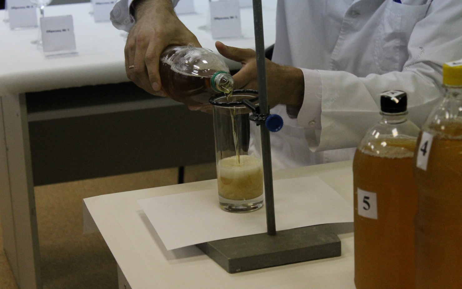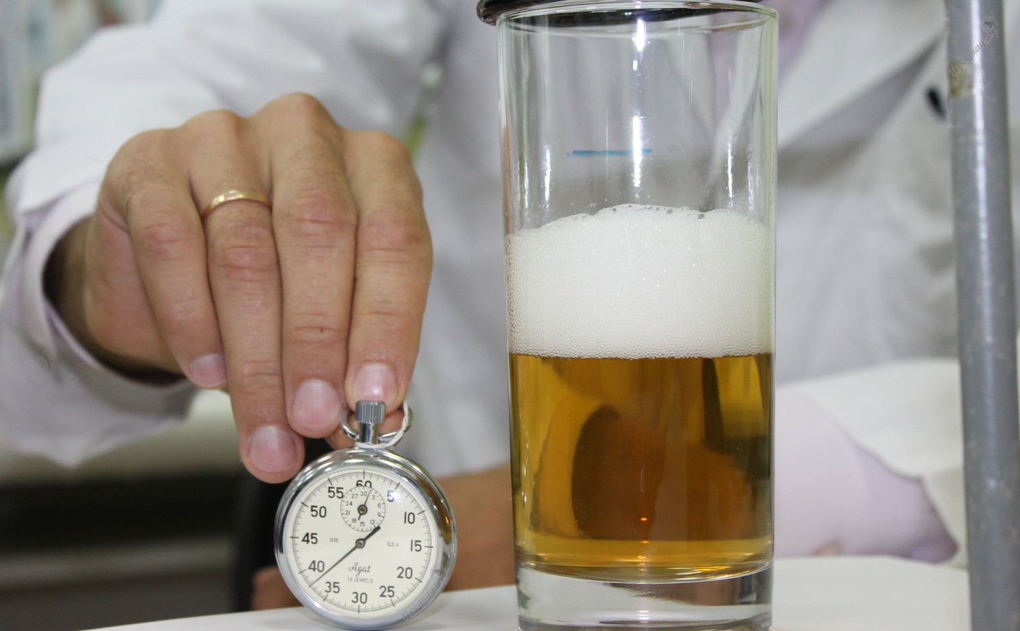 Затем напиток дегустировали эксперты – специалисты ЦСМ, регионального управления Роспотребнадзора, Министерства промышленности, энергетики и торговли края, предприятий торговли, предприятий- изготовителей пива. Они оценивали пиво на вкус, цвет, аромат и даже на пеностойкость. Пена в бокале только что разлитого пива не должна быть меньше 40 миллиметров, а оседание должно проходить не менее трех минут. Это испытание не прошло пиво «Гроссфорт» («Гросфаер») из Москвы, приобретенное в магазине на улице Вавилова, 45. Высота пены была всего 25 миллиметров, а оседание произошло за 2 минуты 30 секунд.